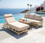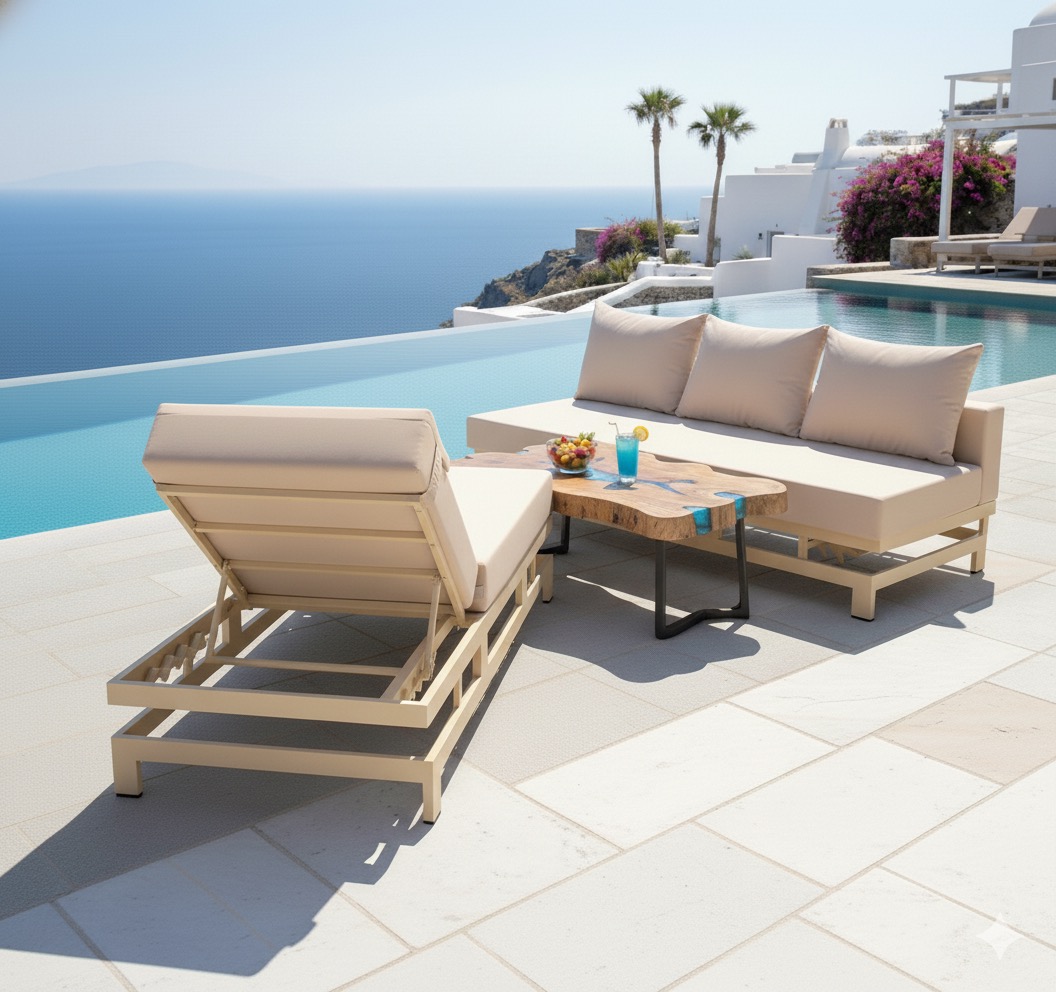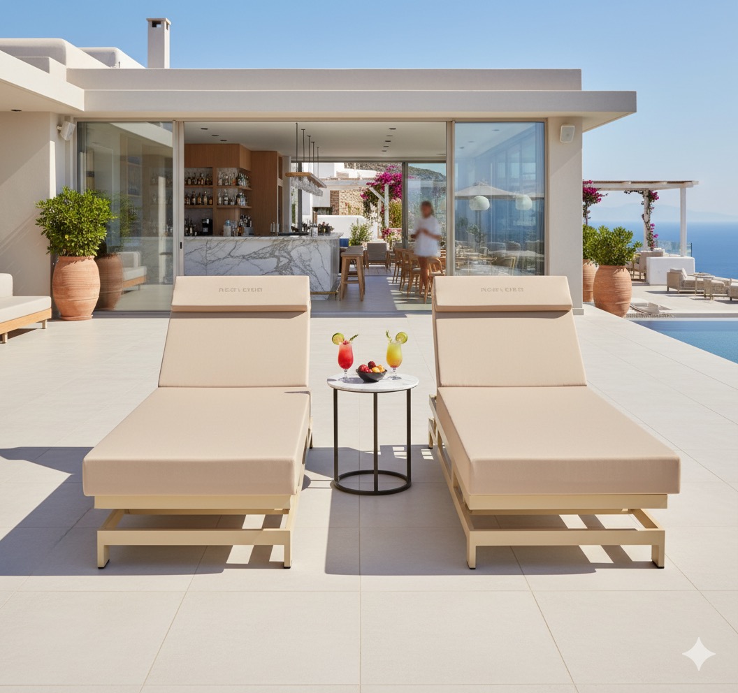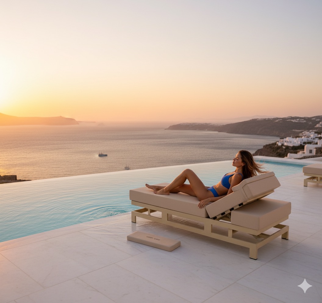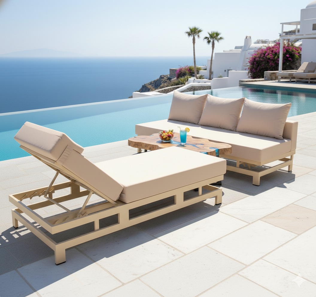 Πολυμορφική ξαπλώστρα πισίνας και κήπου σε γήινους τόνους. Χάρη στον έξυπνο και εργονομικό σχεδιασμό της, μεταμορφώνεται εύκολα και γρήγορα σε καναπέ. Τα διάφορα μαξιλάρια και το στρώμα έχουν επιλεγεί με γνώμονα την άνεση σας. Το ύφασμα των μαξιλαριών και του στρώματος είναι η ολεθίνα, το οποίο είναι αδιάβροχο και εύκολο στο καθάρισμα. Το χαρακτηριστικό το οποίο καθιστά μοναδική την ξαπλώστρα είναι η δυνατότητα εξατομίκευσης με την τοποθέτηση του λογότυπου σας στο σημείο ”Your logo”.